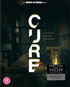 Cure is often cited as an early work of the J-Horror cycle, which was memorably kick-started by the international success of Nakata Hideo’s Ringu in the year following Cure‘s Japanese release. As much a detective story as a psychological horror tale, Cure differs from most of the other films of this subgenre in its absence of clearly defined supernatural elements and refusal to indulge in jump-scares, instead creating a chilling air of sometimes inexplicable menace and becoming as disturbing in its implications as what it is prepared to show or to have its characters surmise. It’s also unique, as Tom Mes points out in his video essay on this very disc, for being a serial killer film in which, a touch paradoxically, there is no serial killer.