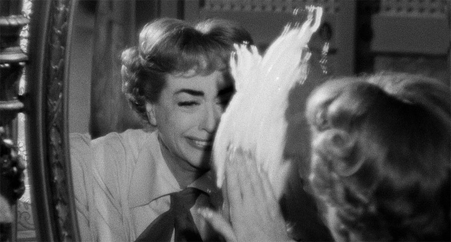 And then there’s Eva, the dark sun around which the other characters orbit, a destructive gravitational pull that they are seemingly unable or unwilling to break free from. As a character, Eva comes across as a heartless, narcissistic and self-centred control freak who expects everybody to bend to her will, and seems to know exactly how to force each of them to do so (remind you of anyone in the current political climate?), but as played with some relish by Joan Crawford, she’s a twisted joy to watch. Crawford really is on excellent form here, able to instil her sharp words with secondary meaning with a flick of her large and expressive eyes or the lilt of her scheming and self-satisfied smile. For me, this peaks with her suggestion to one character that her partner has been unfaithful, and when that person asks who with, the way that Crawford delivers the line, “Who do you think?” actually prompted me to omit a small squeal of delight, in spite of the calculated nastiness of her action. “Any man’s my man if I want it that way,” she claims at one point, and it quickly becomes clear that these are not empty words, and that she is fully prepared to use her past affairs as weapons to manipulate those who fell, however briefly, under her spell. This is given symbolic representation when she makes a telephone call to lie her way out of a party date in order to stay in for an evening meal that will be unexpectedly attended by one of her past flings, and as she spins her yarn to the party host, she snares the man in question by casually looping the telephone cord around his neck and tightening it in the manner of an owner putting her dog on a choke leash. Intermittently, however, cracks in this confidently controlling façade briefly become visible. This first occurs when Eva recalls how the attitudes of others shaped her current personality and completely loses her rag in front of a distressed Jennifer, the second when she is delivered distressing news of a catastrophe that she was instrumental in triggering, and she expresses her furious despair by feverishly obliterating her reflection in a mirror with face cream.